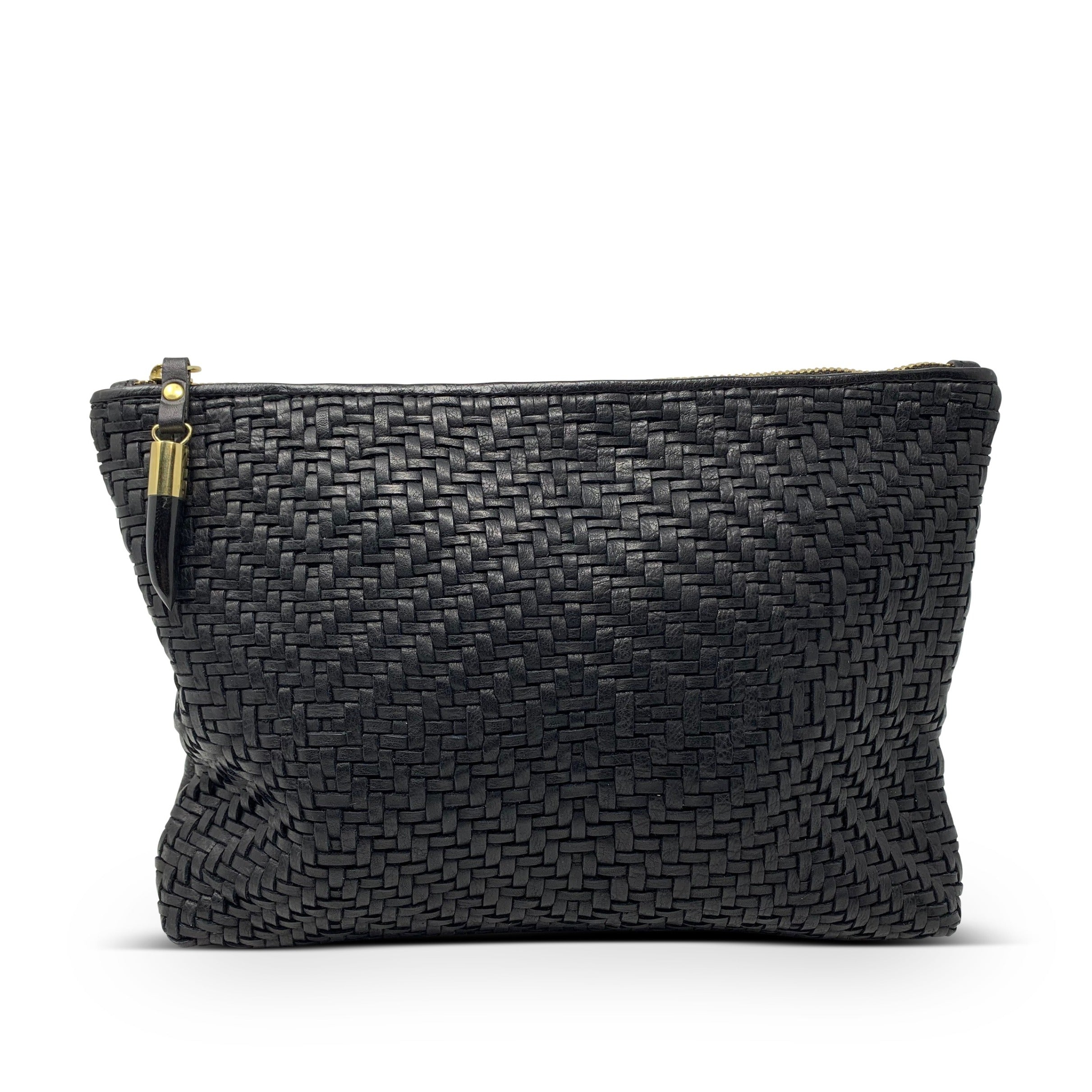 Yes please, leather weave! Classically chic, this gorge medium-sized pouch, with a brilliantly bold butter soft basket weave leather front, simple soft black leather back and finished with our fab upcycled (read more about our give back story) Ankole horn toggle is the absolute bees' knees.