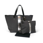 Kempton & Co. Silver Striped Diaper Tote is made from Charcoal Cotton Canvas, trimmed with USA supple black cowhide.