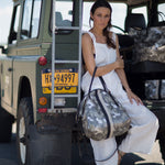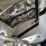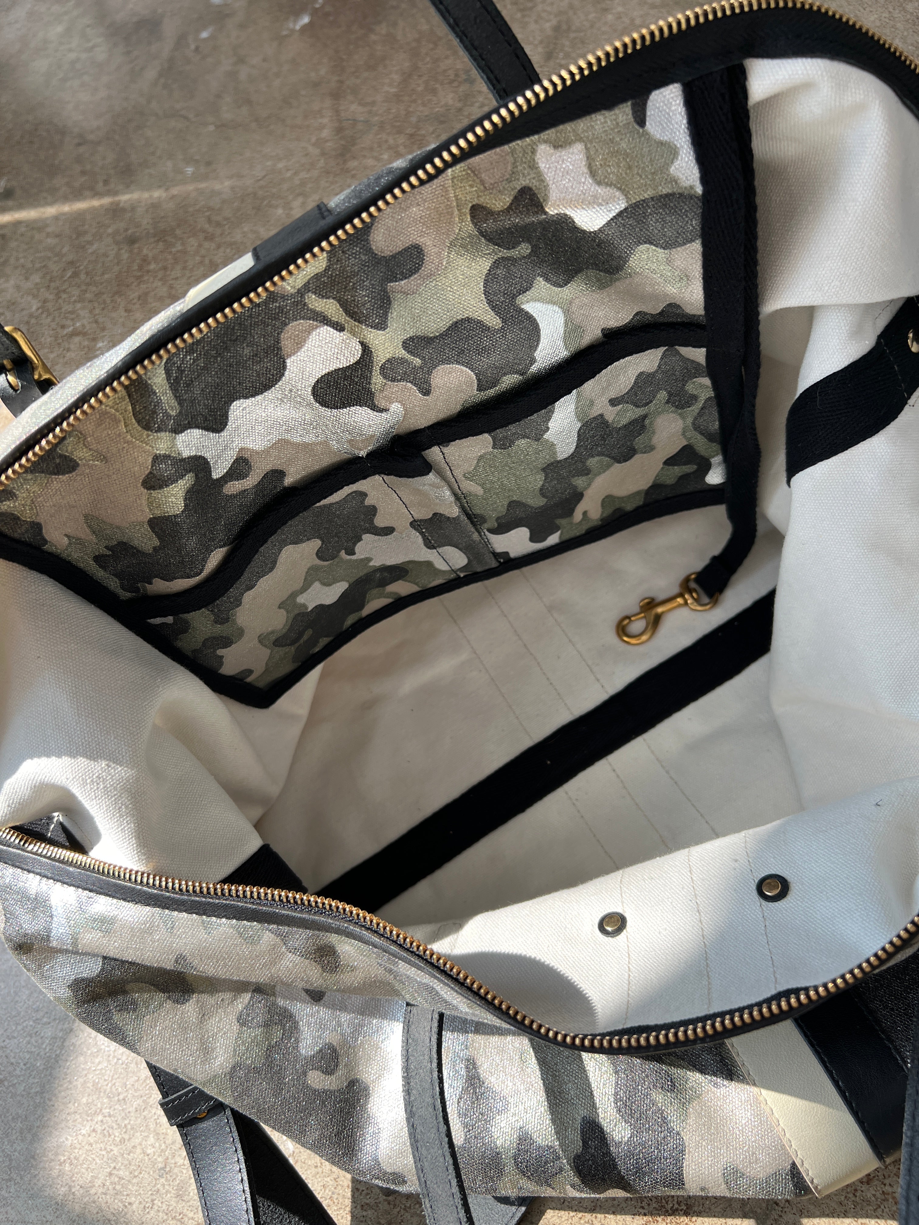 - Metallic camo print rugged luxe canvas* featuring olive-green silver and khaki hues.