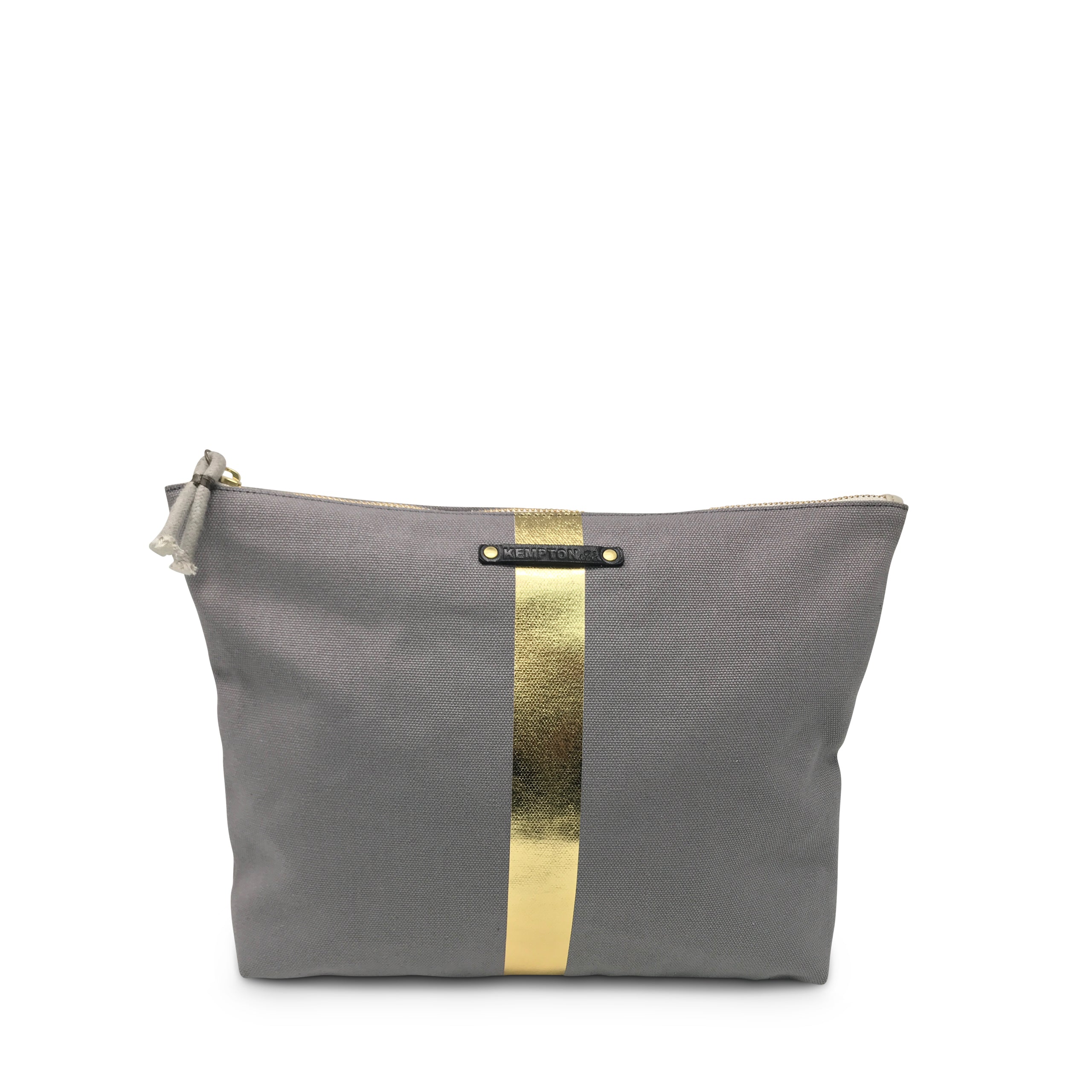 Our Smoke/Gold Stripe Beach Pouch features our classic stripe in gold on smokey canvas. Perfect for your day at the beach and an evening out. Go light this season and carry a clutch- throw in your keys, cash, glam...and go!