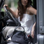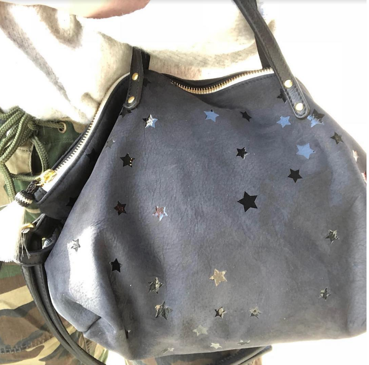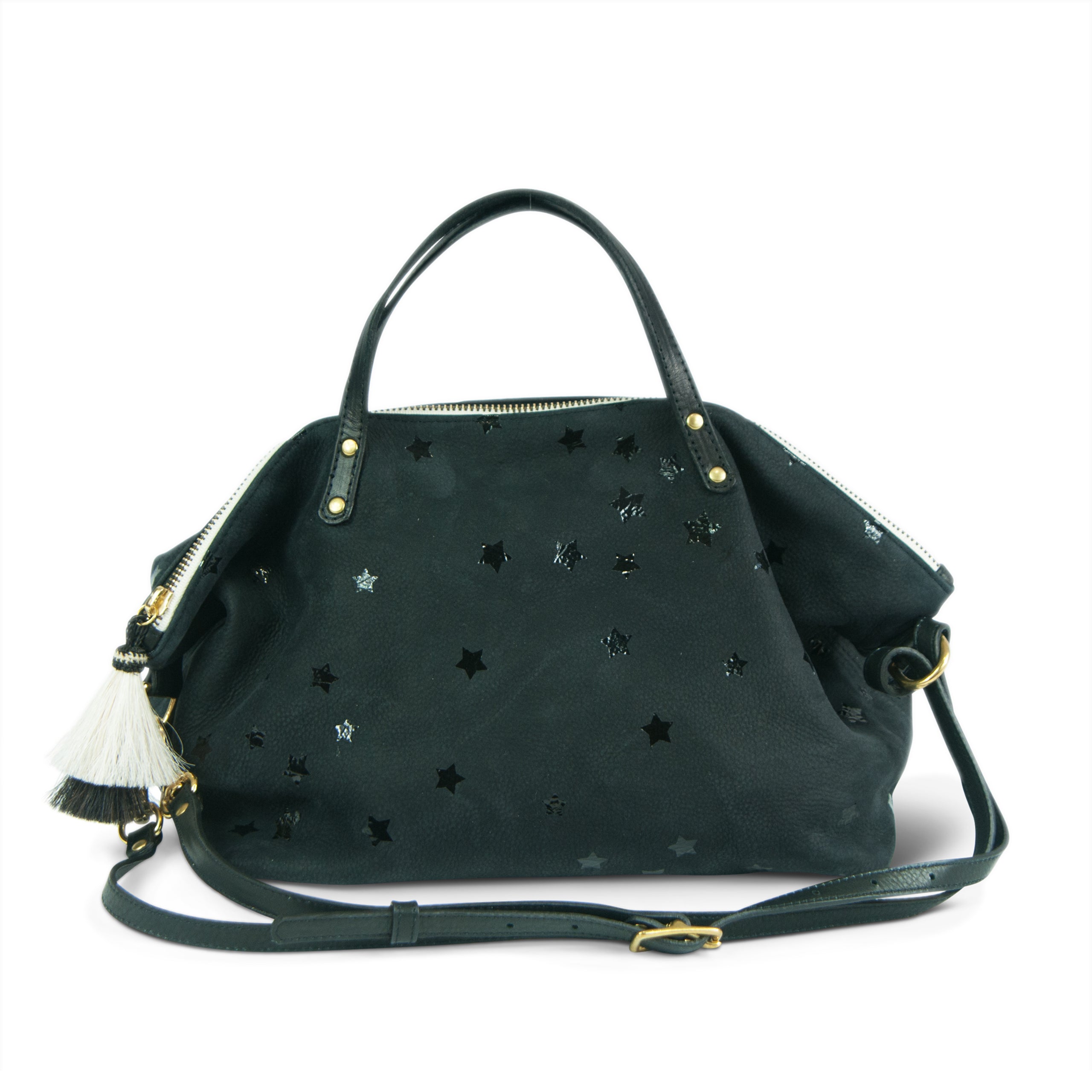 Made with calf skin, and subtle stars printed overall, the Summer Star Devon Holdall features a brass zipper, and is trimmed with black and white zipper tape, brass detail and a double white and black horsehair tassel.