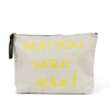 "Wish You Were Here" in yellow text, this large pouch gives you a gentle reminder to all your friends what they're missing out on!