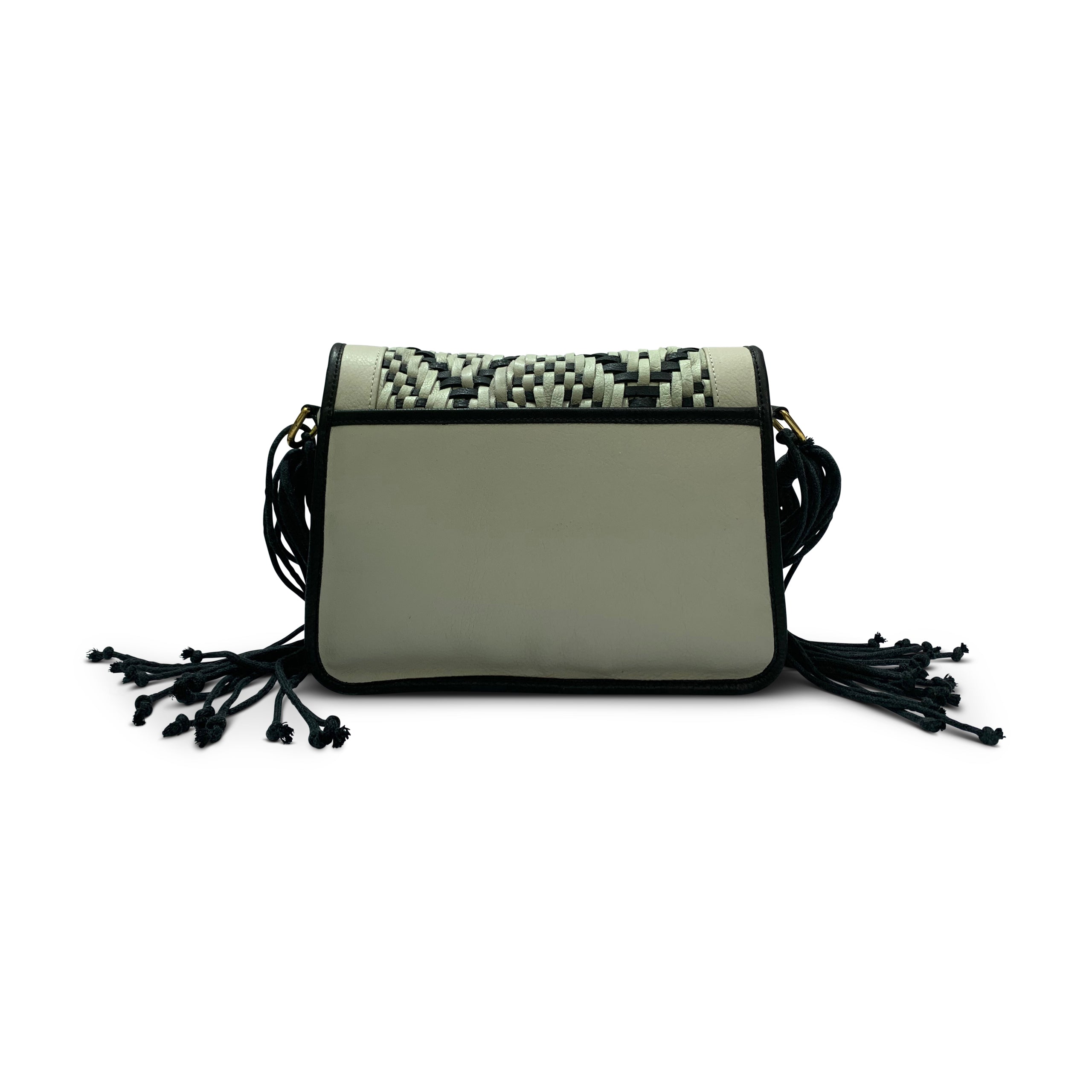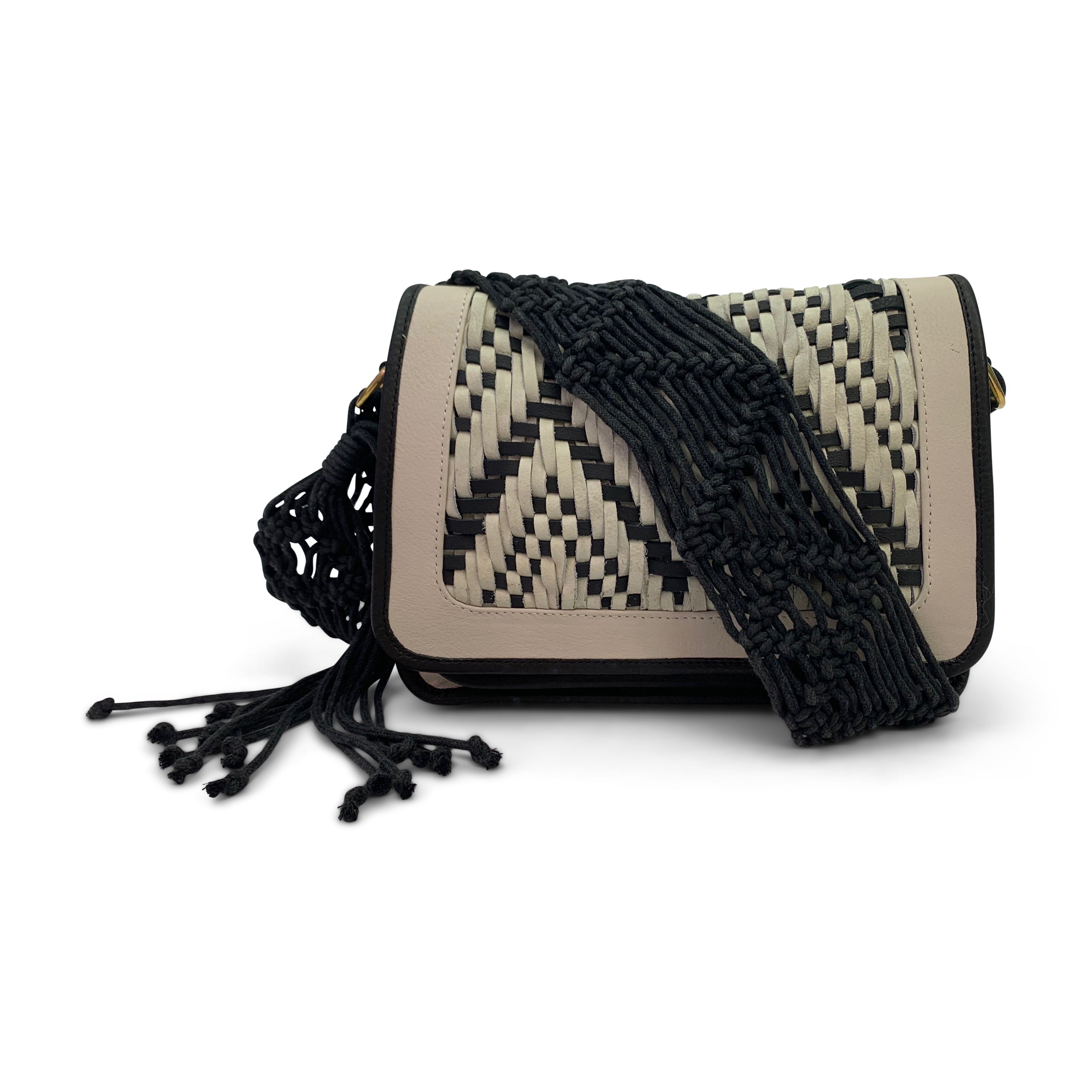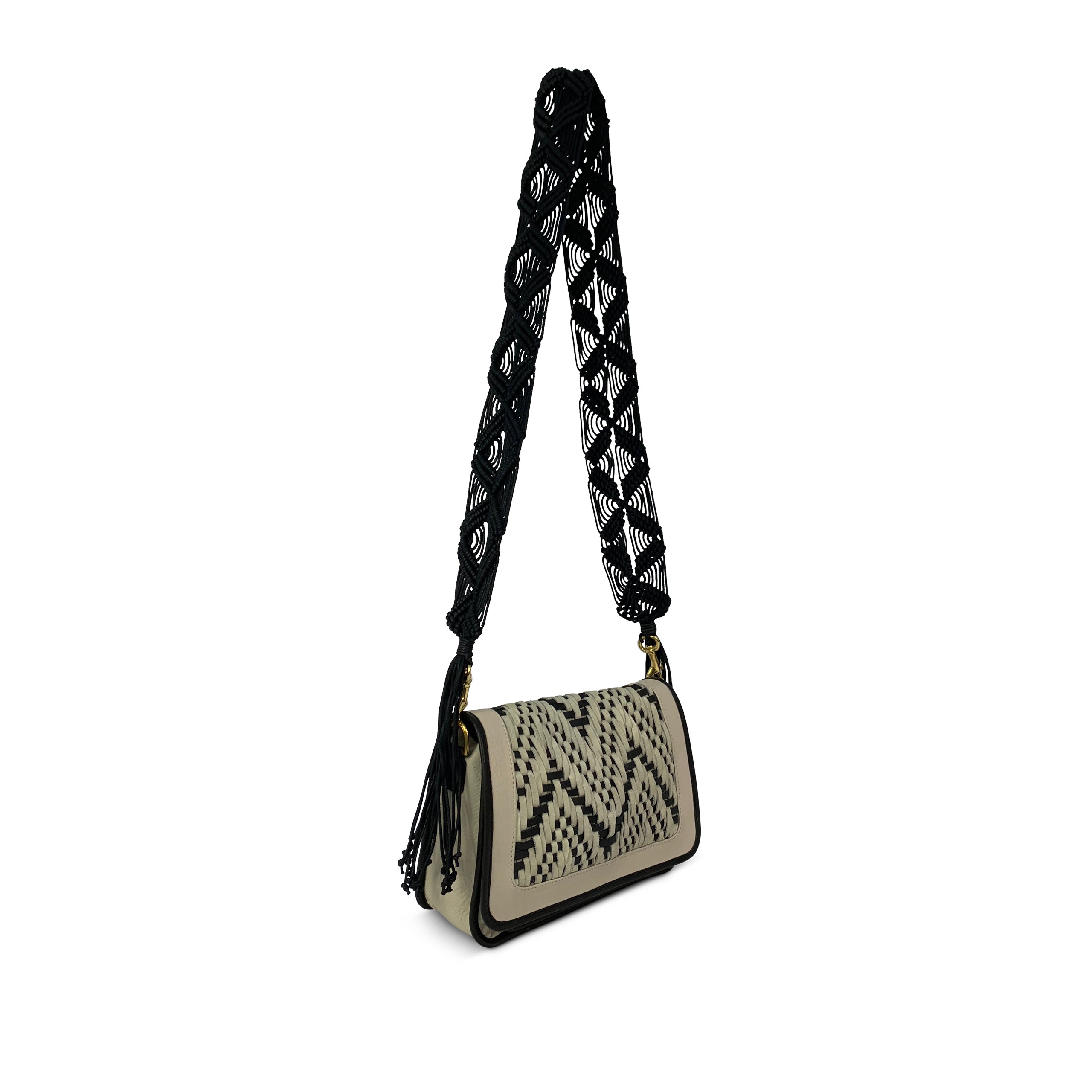 We'd like to introduce our newest style to the Kempton family. Her name is the Eva Shoulder Bag and she is sure to impress. Made from soft black and chalk cowhide leather, fully lined with natural cotton twill, an under flap pocket with snap closure and exterior pocket. Accented with a black macrame strap that can be worn on the shoulder or as short crossbody strap.